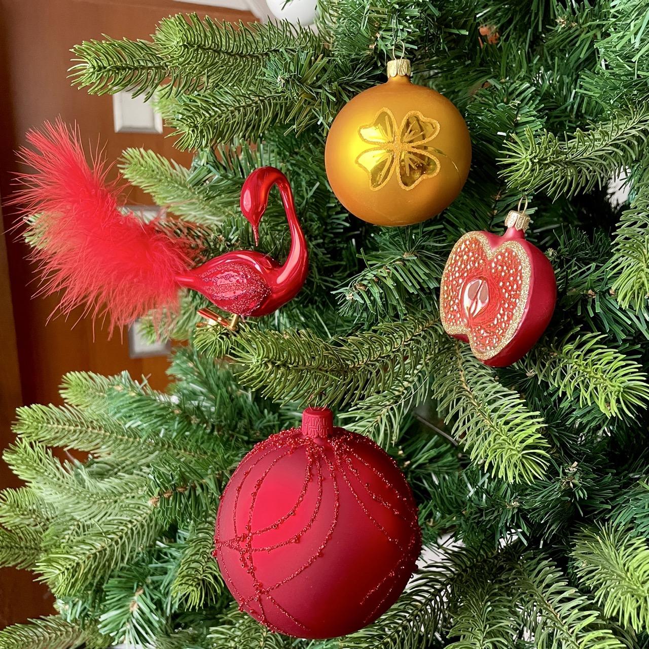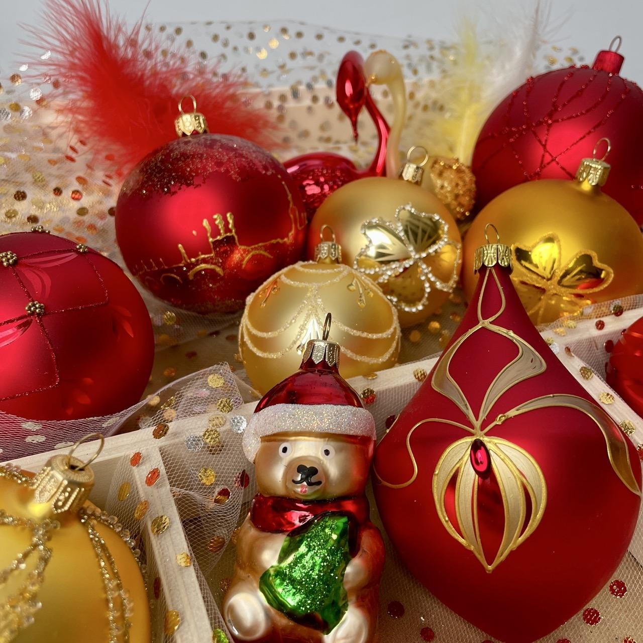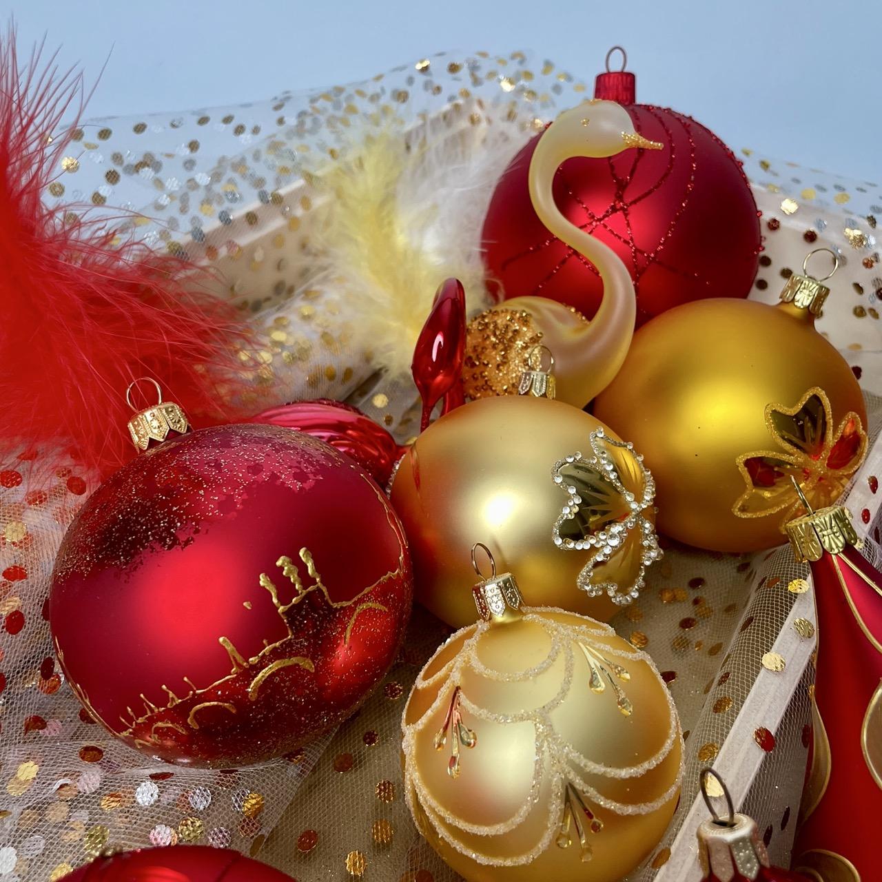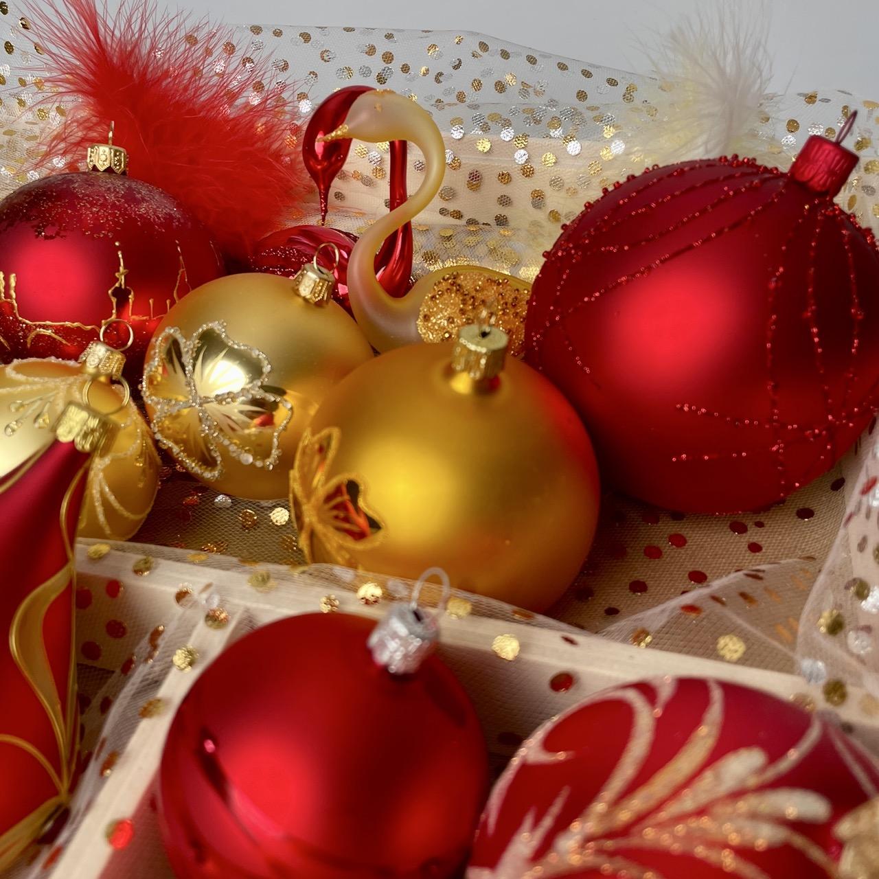 Tento exkluzívny výber ozdôb na zapožičanie v kombinácii červenej, zlatej a žltej obsahuje ručne zdobené gule vo veľkostiach 6, 8 a 10 cm, doplnené širokou škálou maľovaných tvarov vrátane elegantných labutí a vrchnáka stromčeka.
