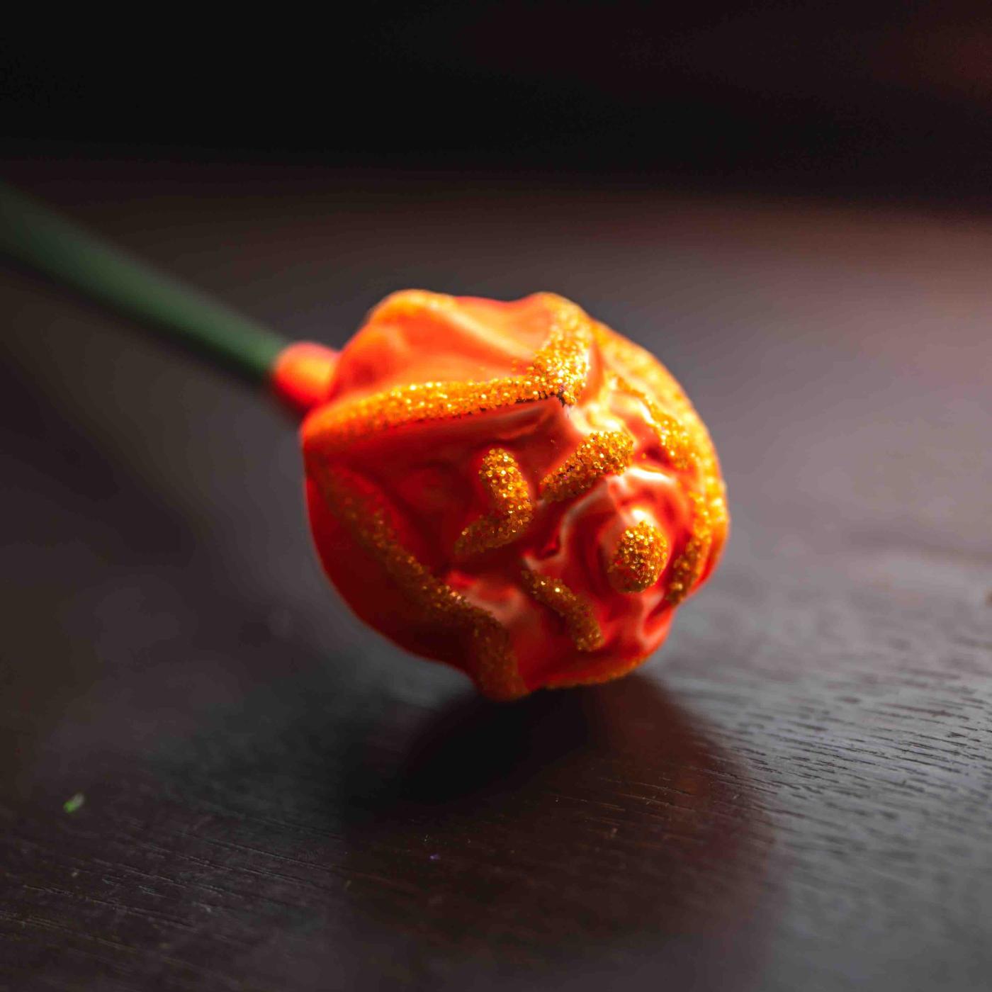 Ručne fúkaný sklenený ornament na drevenej stopke.