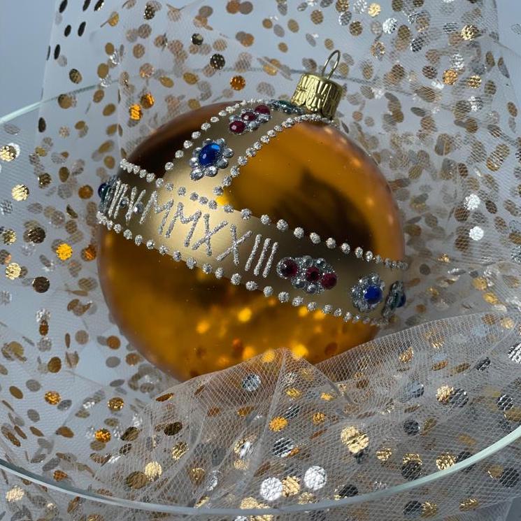 Unikátní baňka při příležitosti korunovace Karla III. je inspirovaná britskými korunovačními klenoty a vychází z předlohy královského jablka. Je zdobena desítkami barevných a čirých kamínků, na zadní straně označená datem korunovace.