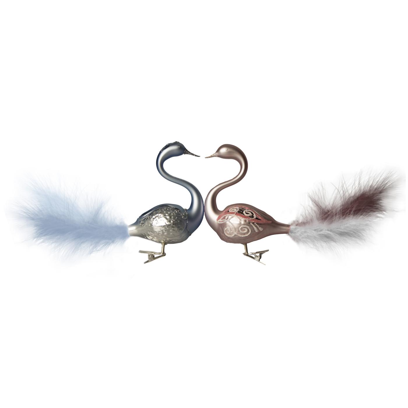 Jedným zo symbolov krásy, pôvabu, ladnosti a elegancie je labuť, a nielen preto sú labute súčasťou našich individuálnych kolekcií ozdôb. Pre ich obľúbenosť a celoročné využitie boli navrhnuté ďalšie originálne páry. Tak ako existuje niekoľko druhov labutí, aj táto kolekcia je veľmi rozmanitá z hľadiska farieb a dekorov. Základom je vždy labuť ručne vyfúknutá do formy a potom sa vďaka zručnosti fúkačov dokončí krk a hlava alebo sklenená korunka. Labute robia radosť naprieč generáciami a sú vhodné ako darček na všetky rodinné aj firemné udalosti. Ako symbol vernosti sú labute ideálne na svadby, či už ako dekorácia alebo darček pre novomanželov. Nebojte sa ozdobiť stromček množstvom labutí. Vďaka ich tvaru a prírodnému periu bude vyzerať ešte slávnostnejšie. Páry labutí sú krásne aj ako celoročné dekorácie na stôl, nielen na slávnostné príležitosti.