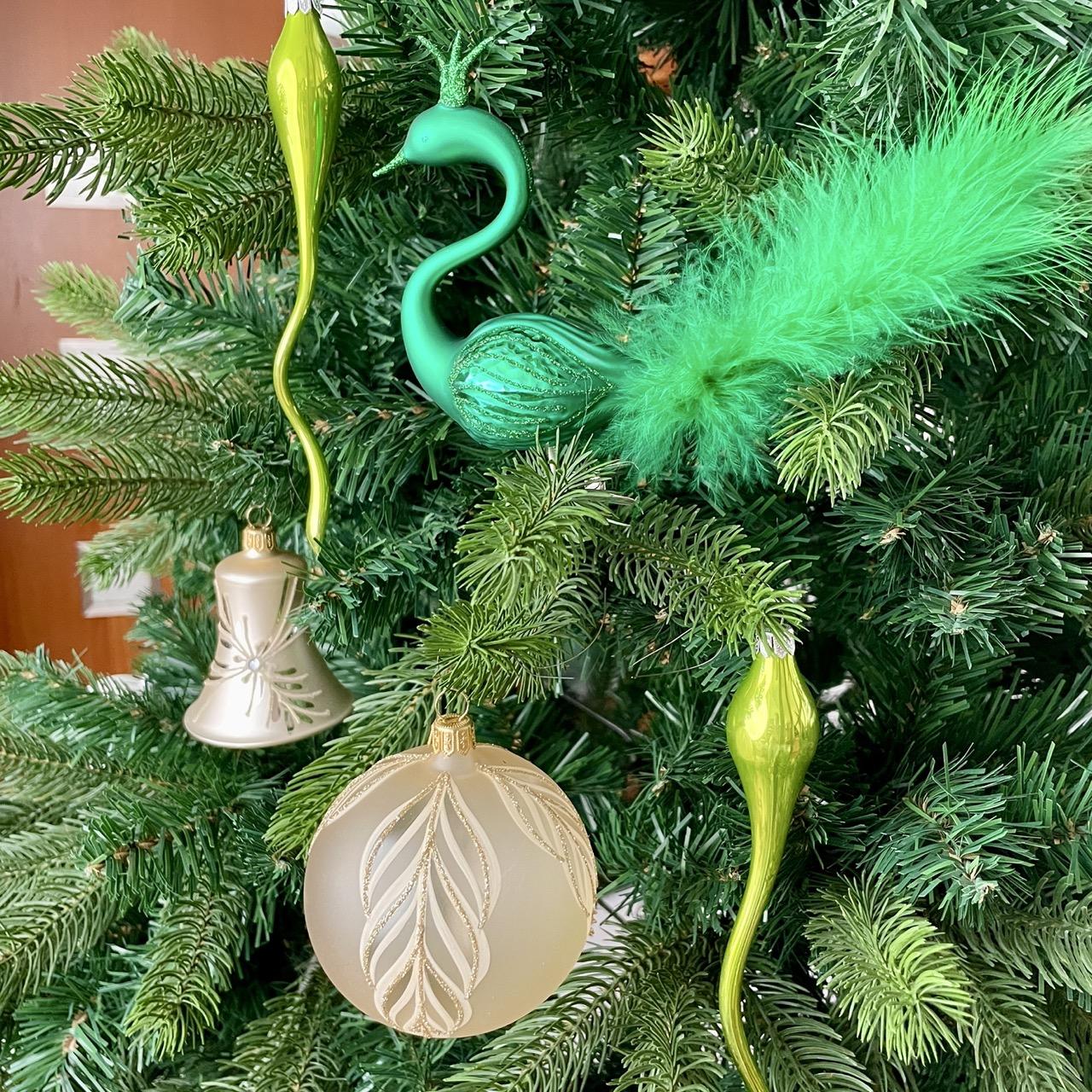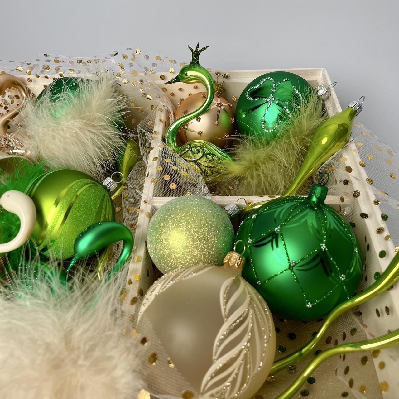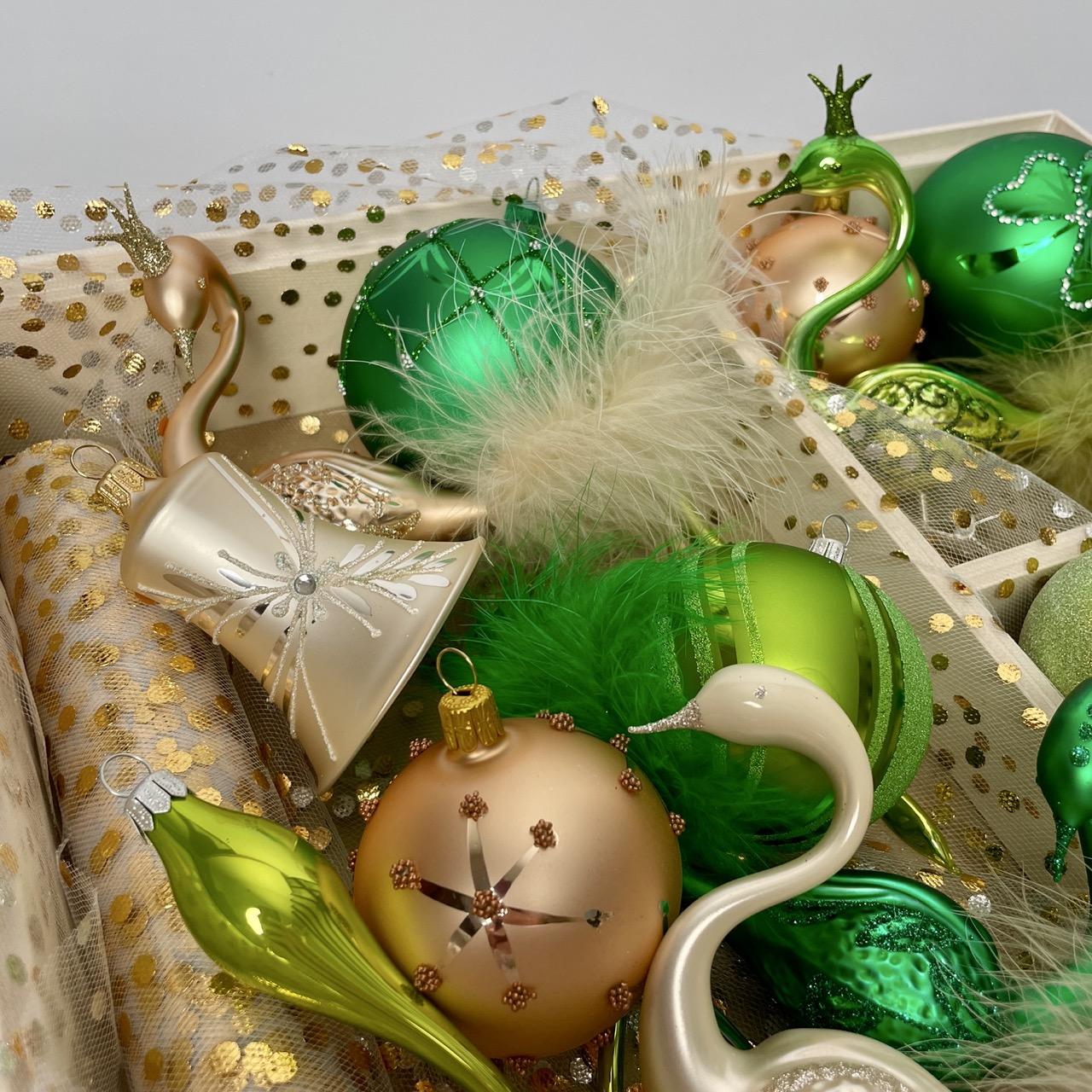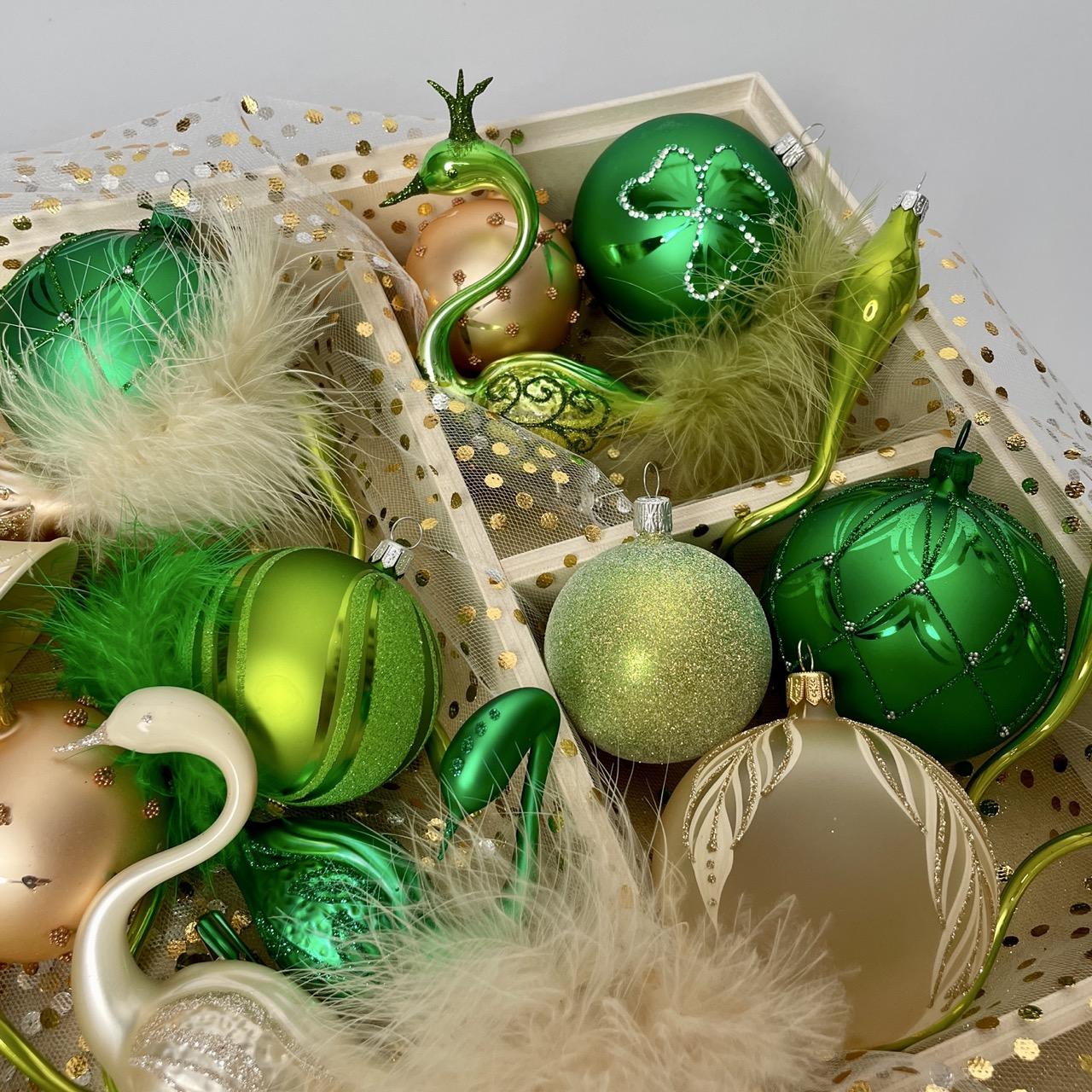 Tento exkluzívny výber ozdôb na zapožičanie v prírodných tónoch zelenej a béžovej obsahuje ručne zdobené gule vo veľkostiach 6, 8 a 10 cm, ktoré dopĺňa široká škála maľovaných tvarov vrátane majestátnych labutí, stromčekov a dlhých elegantných tvarov.
