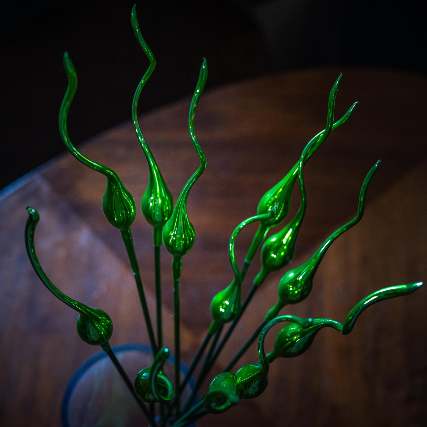 Ručne fúkané sklenené ozdoby na drevenej stopke.