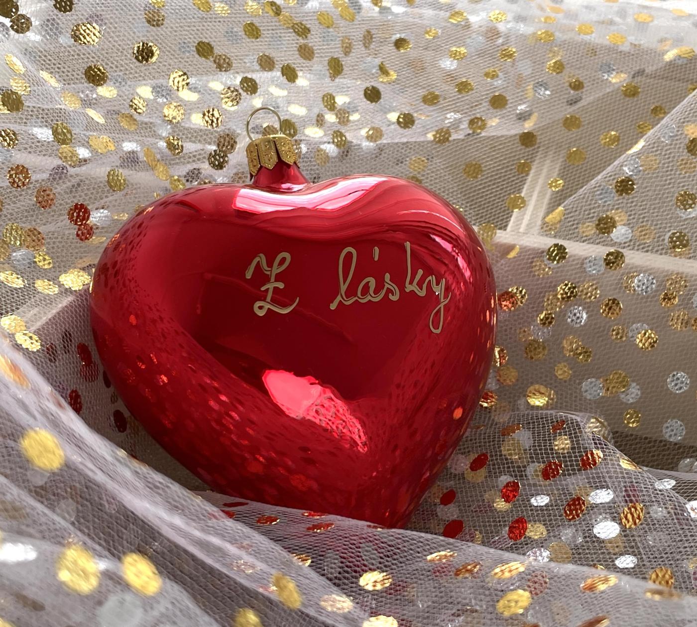 Ručně foukané červené srdce s ručním zlatým nápisem, které vyjádří lásku nebo poděkování i beze slov — nebo s nimi.