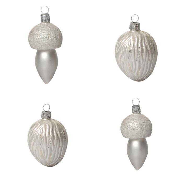 Sklenené vianočné ozdoby basic Bianco - Bianco orech a huby, 4 ks