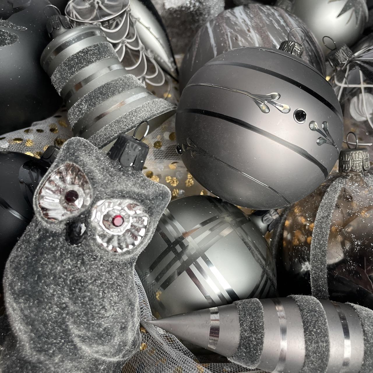 Ako osloviť mužov, nieto ešte mladých mužov? Čierna farba a jej odtiene, teda sivá, je moderná, nadčasová a prekvapivo výrazná aj na vianočnom stromčeku! Hoci ide o odtiene čiernej, kolekcia je prekvapivo jemná. Guľôčky sú zdobené pravidelnými vzormi vo flokovej úprave, po ktorých vzniká mäkký semišový povrch, ktorý pozýva na dotyk. Basic Nero zaujme všetkých, ktorí majú radi tradičné veci v modernej úprave. Kombinácia fúkaných vianočných ozdôb a čiernej farby nepochybne poteší nielen mužov.