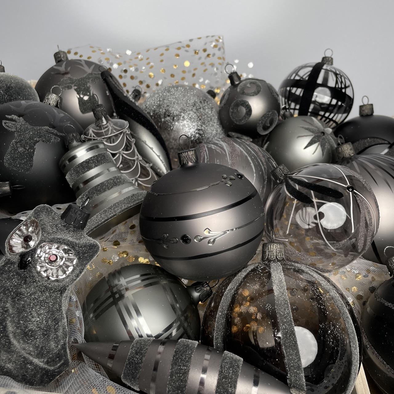 Ako osloviť mužov, nieto ešte mladých mužov? Čierna farba a jej odtiene, teda sivá, je moderná, nadčasová a prekvapivo výrazná aj na vianočnom stromčeku! Hoci ide o odtiene čiernej, kolekcia je prekvapivo jemná. Guľôčky sú zdobené pravidelnými vzormi vo flokovej úprave, po ktorých vzniká mäkký semišový povrch, ktorý pozýva na dotyk. Basic Nero zaujme všetkých, ktorí majú radi tradičné veci v modernej úprave. Kombinácia fúkaných vianočných ozdôb a čiernej farby nepochybne poteší nielen mužov.