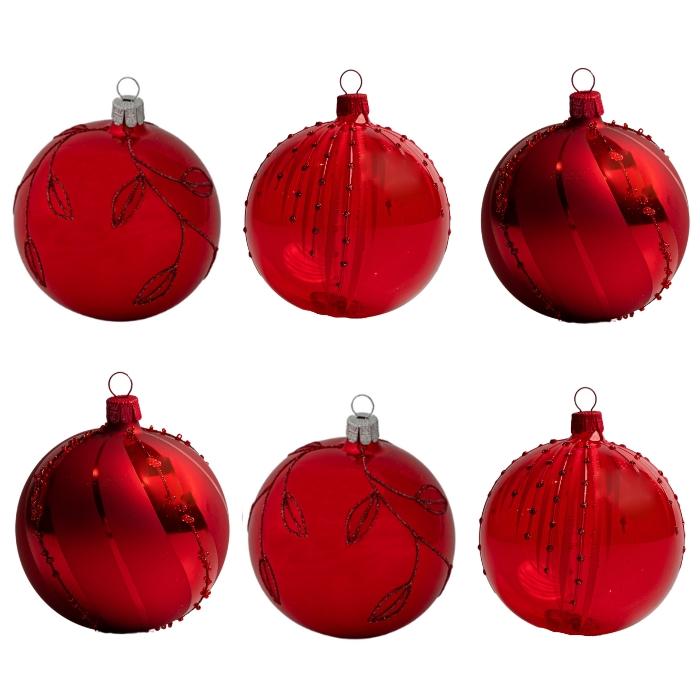 Sklenené vianočné ozdoby basic Red - Červené gule zdobené, 6 ks