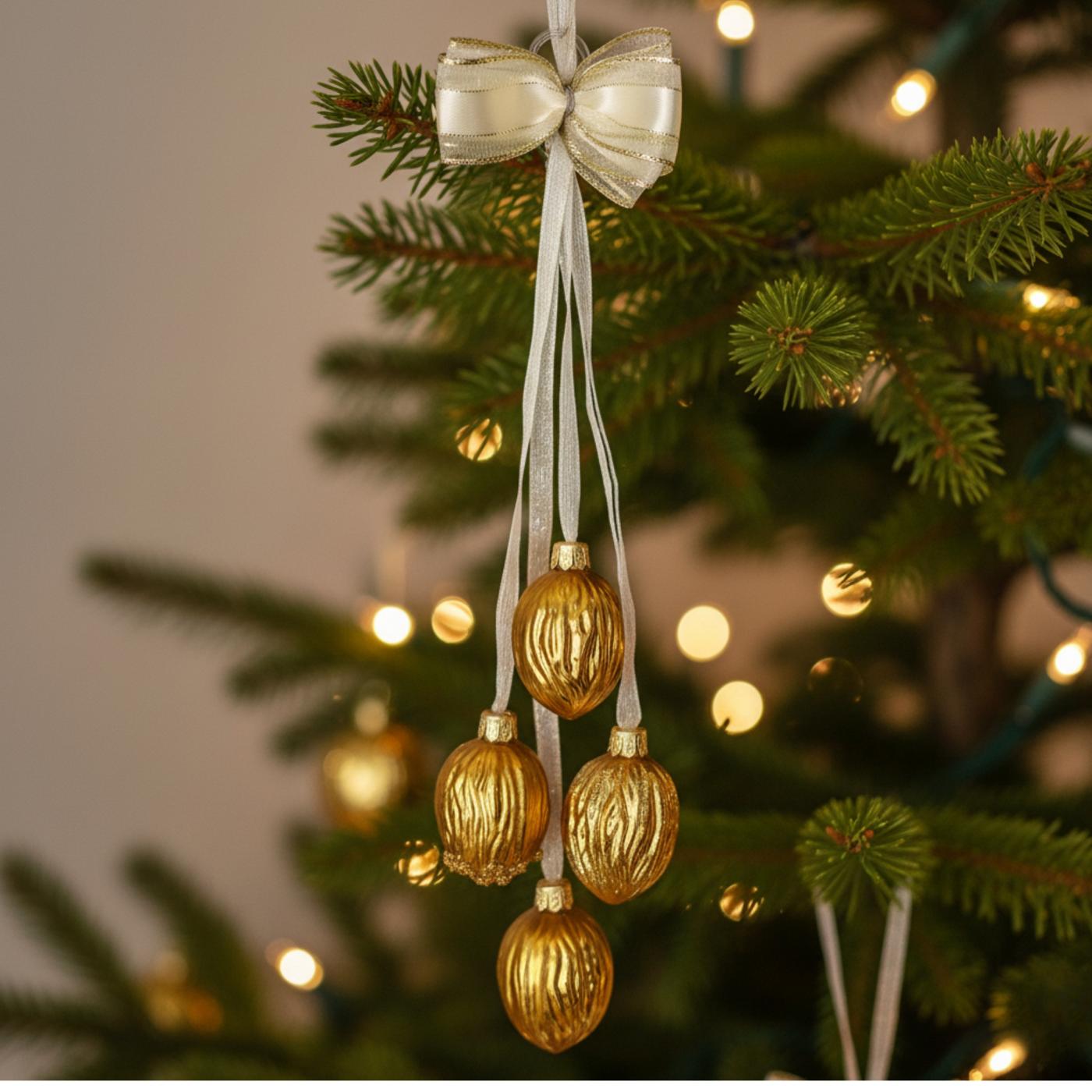 - 1 ks Balíček zlatých orechov, 4 orechy (cca 3,5 cm) na stužke uviazanej na krúžku na zavesenie.