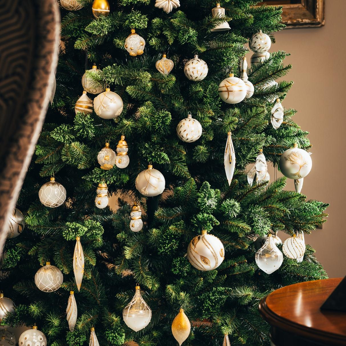 okrúhle banány, zvončeky, olivy a rampúchy, ktoré dopĺňajú tvary srdiečok, snehuliakov a dobrosrdečných Santov. Ručne zdobené jemnými líniami pôsobia ľahko a sviežo. Biela a zlatá je dekoratívnou výzdobou interiéru v neutrálnych tónoch, hodí sa aj do kancelárie vyšších manažérov, kde vynikne svojou ľahkosťou a eleganciou.