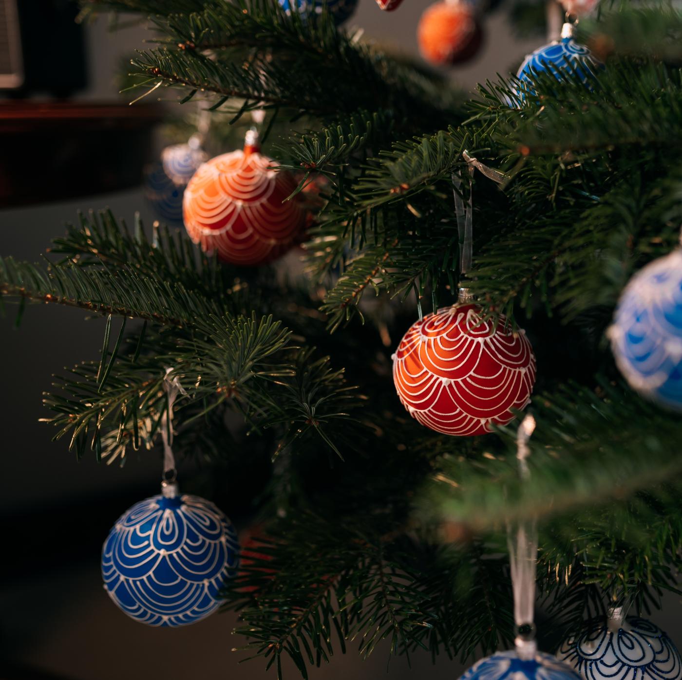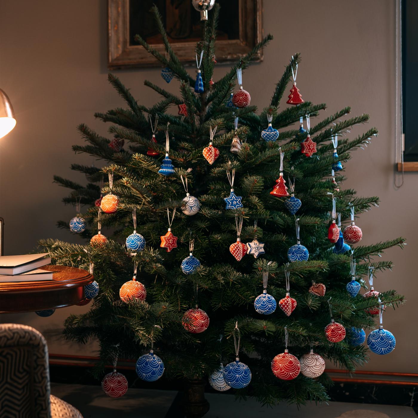 Na stromček strednej výšky (približne 180 cm) odporúčame celkom 90-100 kusov ozdôb. V našom štúdiu sme použili 5x12 perníkov a 30 okrúhlych banerov. Dominantný podiel červenej a modrej farby dopĺňa približne 1/5 ozdôb v bielej farbe. Perníky je najlepšie zavesiť na bielu stuhu.