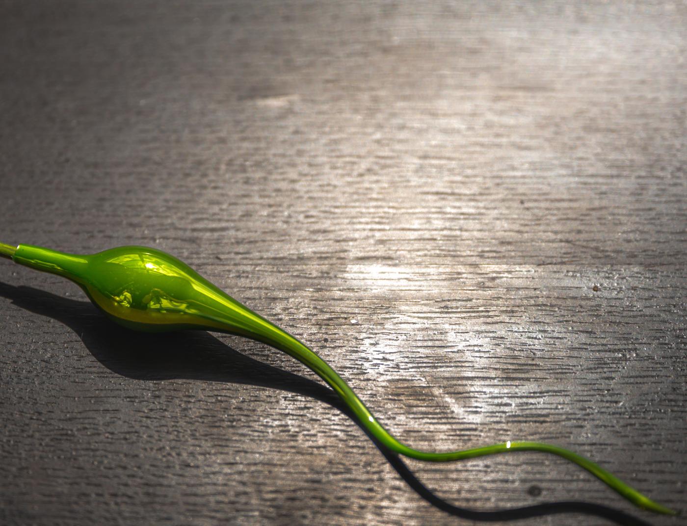 Ručne fúkaný sklenený ornament na drevenej stopke.