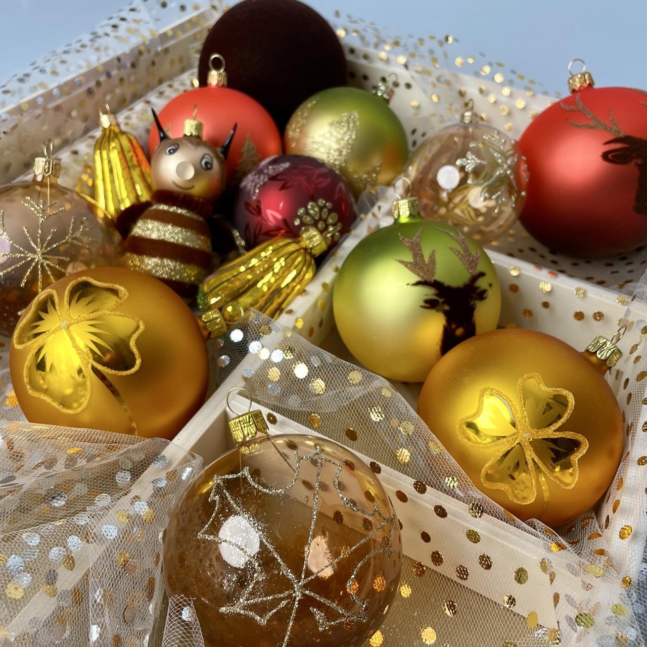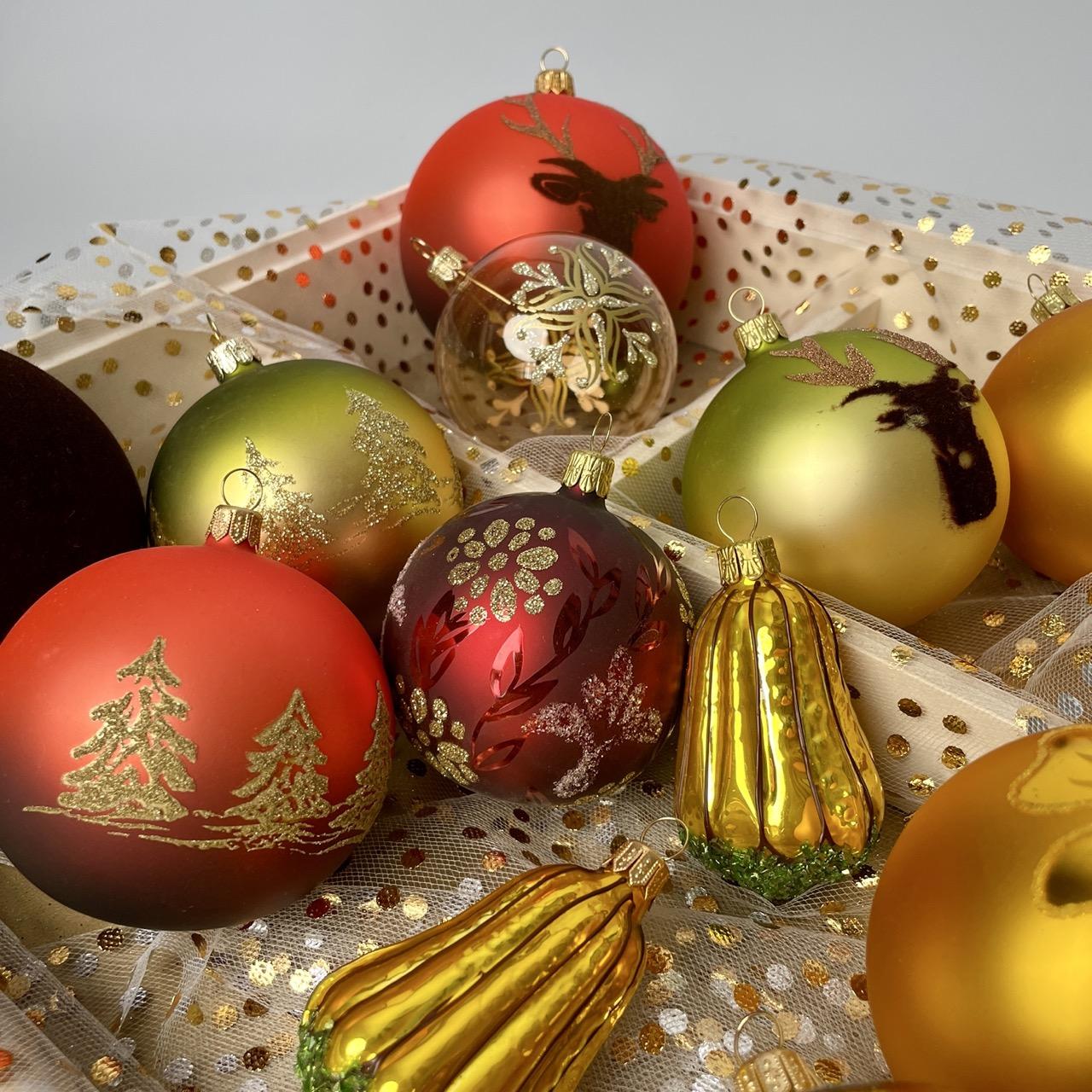 Tento exkluzívny výber ozdôb na zapožičanie v prírodných tónoch a motívoch obsahuje ručne zdobené gule vo veľkostiach 6, 8 a 10 cm, doplnené širokou škálou maľovaných tvarov vrátane figúrok a vrchnáka na stromček.